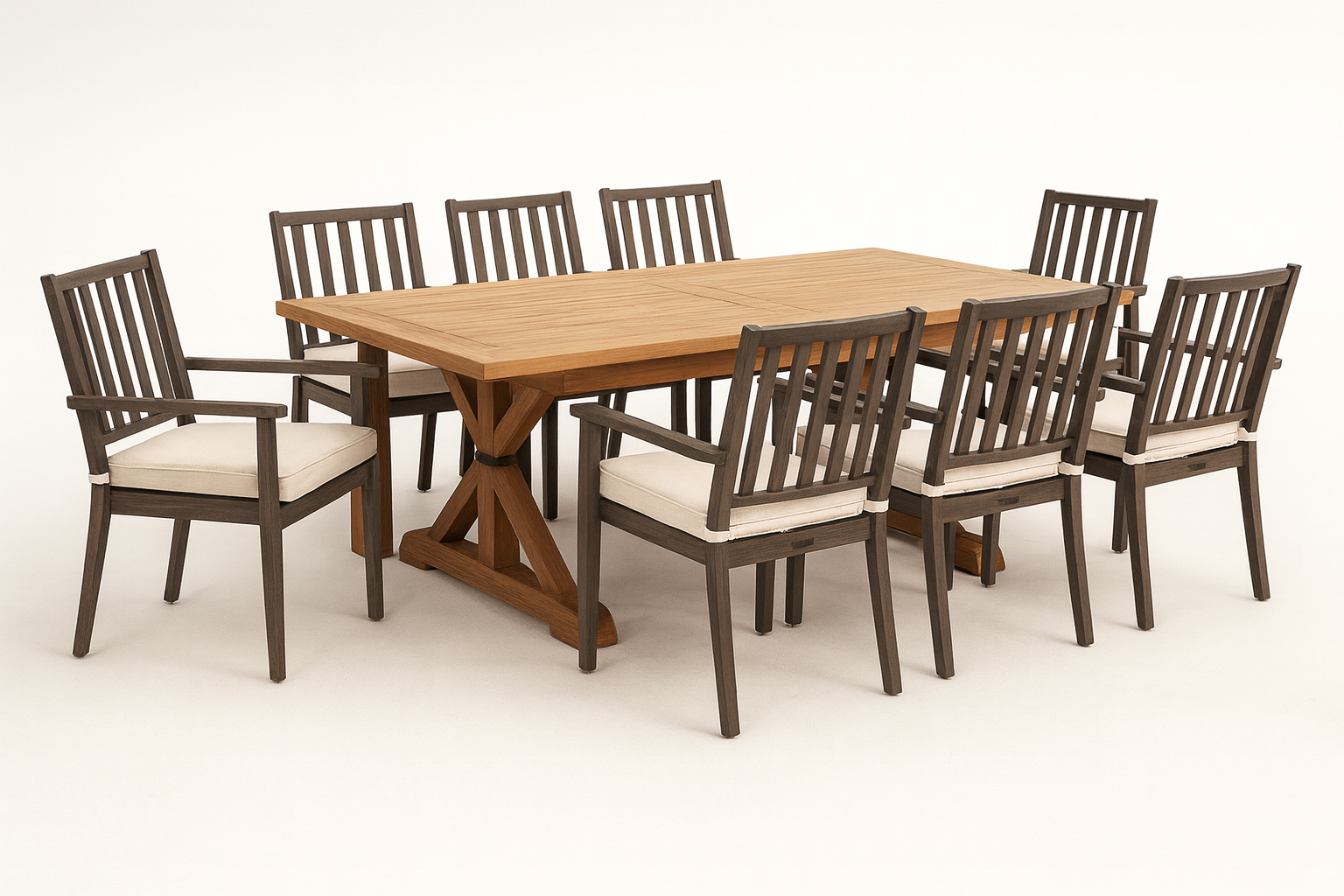 Crafted to elevate outdoor entertaining, this 8-piece teak dining set blends timeless elegance with exceptional durability. The solid teak table showcases a rich, natural grain and bold trestle-style base, paired with eight powder-coated metal chairs featuring refined slatted backs and plush, weather-resistant cushions. Designed for spacious patios and gatherings that linger into the evening, this set delivers a sophisticated dining experience inspired by resort living and elevated craftsmanship.